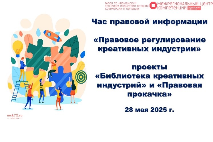 28 мая 2025 года для обучающихся группы МФС-24-9-1 ГАПОУ ТО «Тюменский техникум индустрии питания, коммерции и сервиса» проведено мероприятие, посвященное правовым вопросам по регулированию деятельности креативных индустрий.