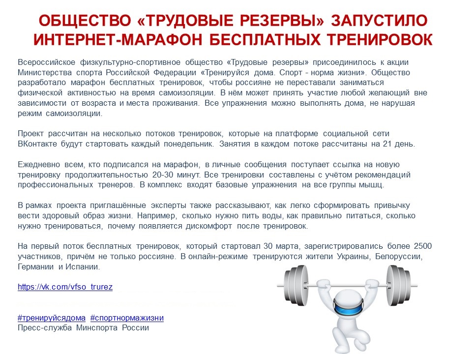 Уважаемые обучающиеся, родители и сотрудники «Техникума индустрии питания, коммерции и сервиса», в связи с переходом на дистанционное обучение, тренировочный процесс теперь проходит в онлайн режиме, на площадке социальной сети ВК создана специальная группа - "Спорт в МЦК", где размещаются программы тренировок для общего развития и поддержания здорового образа жизни. Здесь вы можете не только воспользоваться рекомендациями по выполнению различных вариантов упражнений, а также предложить свои.